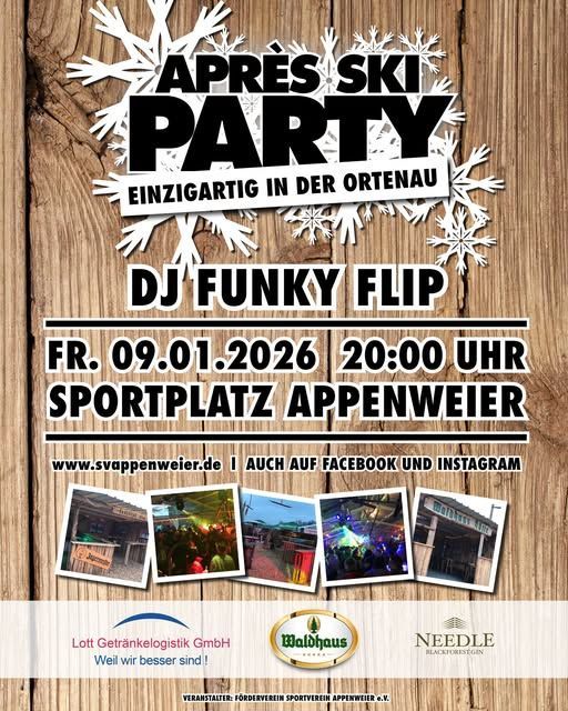 Am 9. Januar 2026 ist es wieder soweit: die legendäre Après-Ski-Party in Appenweier, mit DJ Funky Flip! Das Sportgelände verwandelt sich auf einzigartigeweise in ein alpines Dorf mit rustikalen Hütten, Bars und mottotypischen Dekorationselementen, die man aus den Skigebieten kennt. 🏂 Die besondere Atmosphäre sucht in der Ortenau seines Gleichen und erinnert an Après-Ski in Sölden, Ischgl oder St. Anton. Startet das Partyjahr 2026 mit Après Ski in Appenweier – Skioutfits an und ab nach Appenweier! ⛷ Freitag, 09.01.2025 - ab 20:00 Uhr Wir freuen uns mit euch die "erste" große Party im neuen Jahr zu feiern!
