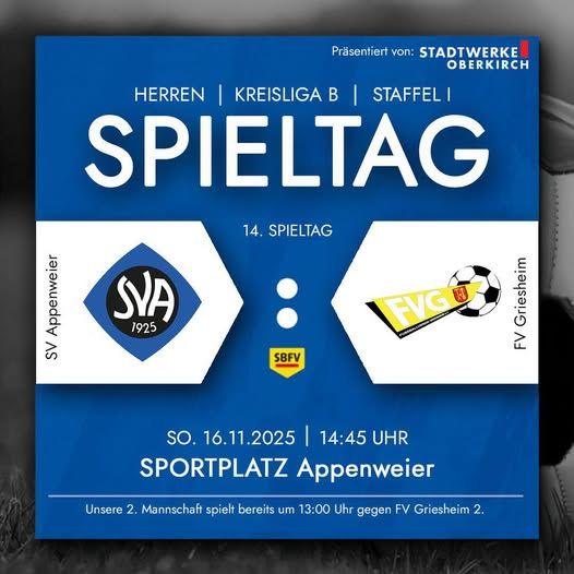 Wir empfangen die Mannschaften des FV Griesheim. Unsere Zweite kann mit einem Sieg ihren starken 2. Tabellenplatz festigen, während die Erste endlich wieder dreifach punkten muss, um nicht im Tabellenmittelfeld stecken zu bleiben. Auch wenn heute der Tabellenvierzehnte zu Gast ist, darf dieses Spiel auf keinen Fall unterschätzt werden. Nur als Team kann heute gepunktet werden! Im Anschluss an die Spiele der Herren treten noch unsere A-Junioren gegen Durbachtal um 17 Uhr an. Kommt vorbei und verbringt einen schönen Sonntag beim SVA! Es wird gegrillt, es gibt Glühwein und auch das Clubheim ist geöffnet – doppelte Bewirtung, wir sind bereit für euch! Der heutige Spieltag wird präsentiert von: Stadtwerke Oberkirch GmbH