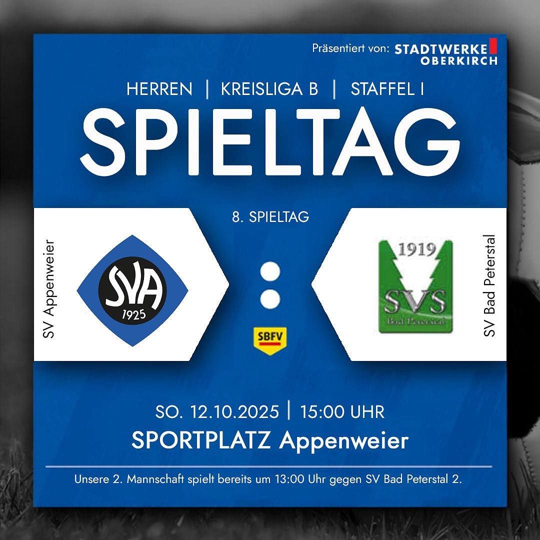 Wir begrüßen heute herzlich unsere Gäste aus Bad Peterstal im Waldstadion Appenweier! Beide Teams stehen punktgleich im oberen Tabellendrittel – Spannung ist also garantiert! 🔥 Unterstützt unsere Mannschaften lautstark, damit sie heute die drei Punkte in Appenweier behalten! 💪 📅 Spielplan heute: 13:00 Uhr – Reserve: Appenweier II 🆚 Bad Peterstal II 15:00 Uhr – Erste Mannschaft: Appenweier I 🆚 Bad Peterstal I Bereits jetzt läuft das Spiel der A-Jugend gegen die SG Kippenheim ⚽ Kommt vorbei, genießt den Fußball und lasst es euch gutgehen – für das leibliche Wohl ist bestens gesorgt! 🍻🌭 Der heutige Spieltag wird präsentiert von Stadtwerke Oberkirch GmbH