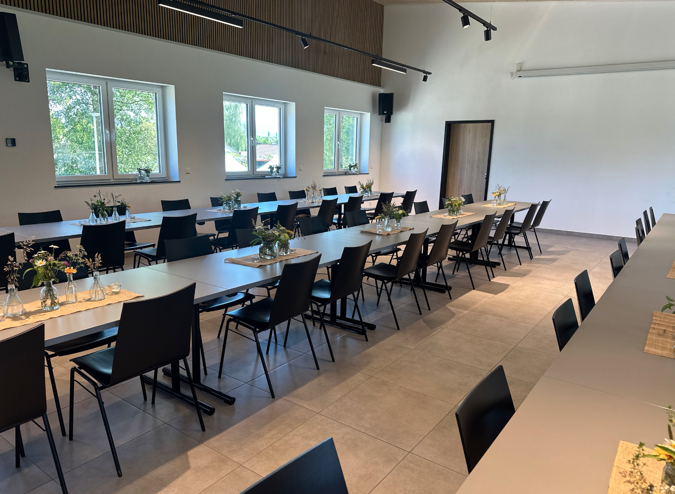 🔹 Schlichte und moderne Tische (160x80cm) sowie schwarze Stühle