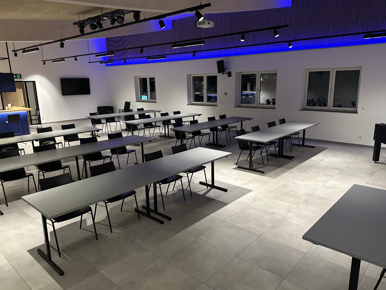 Ein echtes Highlight ist die dunkelblaue Theke, die als stilvoller Eyecatcher im Raum wirkt. Der Raum bietet Platz für bis zu 100 Personen und ist flexibel bestuhlbar – egal ob: