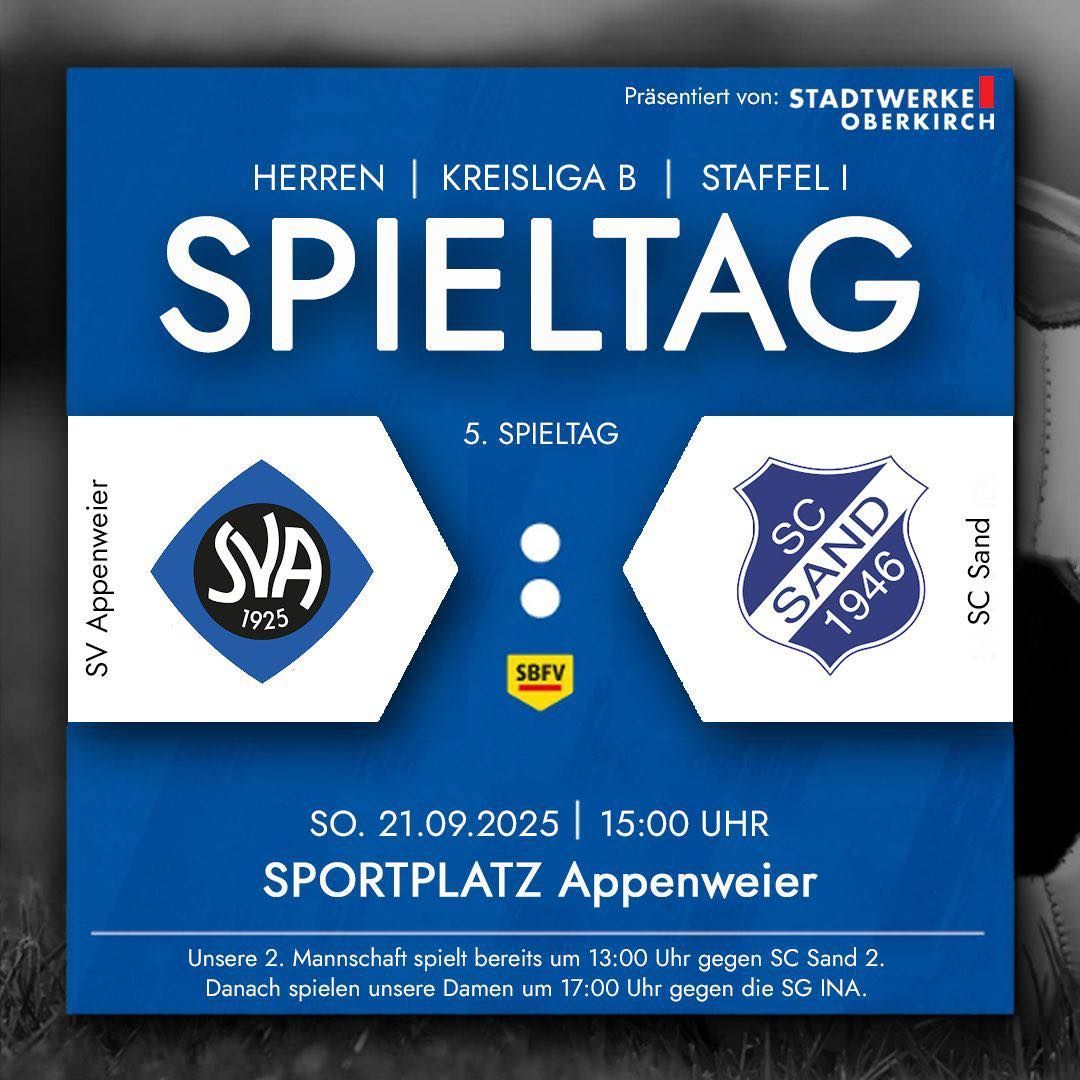 Heute ist es soweit: Am großen Jubiläumsspieltag empfangen unsere Herrenmannschaften den SC Sand / Unsere Damen die SG INA Unsere Herren-Teams wollen an die zuletzt starken Leistungen anknüpfen, die Sander konnten am vergangenen Wochenende ebenfalls drei Punkte holen. Es wird also ein intensives Duell, in dem Konzentration und Laufbereitschaft bis zum Schlusspfiff über den ersten Heimsieg entscheiden können. 💪 Auch unsere Damenmannschaft startet heute in ihre Saison. Nutzt die Gelegenheit, sie gleich zu Beginn tatkräftig gegen INA zu unterstützen! 🙌 Für beste Verpflegung ist natürlich gesorgt: ☕ Kaffee & Kuchen 🍻 Bierwagen 🥓🍟 Herzhaftes vom Grill, Pommes und vieles mehr 📅 Spielplan des Jubiläumsspieltags: • Herren 2: 13:00 Uhr • Herren 1: 15:00 Uhr • Damen: 17:00 Uhr Kommt vorbei, feuert unsere Teams an und feiert mit uns den Jubiläumsspieltag! 🔵⚪ Der heutige Spieltag wird präsentiert von: Stadtwerke Oberkirch GmbH