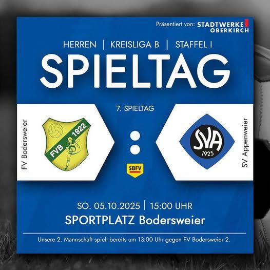 Heute reisen unsere beiden Herrenmannschaften des SVA nach Bodersweier. Der letztjährige Vizemeister der Staffel 1 darf keinesfalls unterschätzt werden. Aktuell steht die erste Mannschaft des FV Bodersweier mit 10 Punkten auf Platz 5 der Tabelle. Mit geschlossener Teamleistung, Willenskraft und Laufbereitschaft ist heute aber alles möglich, holen wir die Punkte mit nach Hause! 💪 Kommt vorbei und unterstützt unsere Jungs im Hanauerland beim FV Bodersweier! 🔵⚪ 📅 Anpfiff Zweite: 13:00 Uhr 📅 Anpfiff Erste: 15:00 Uhr Der heutige Spieltag wird präsentiert von: Stadtwerke Oberkirch GmbH
