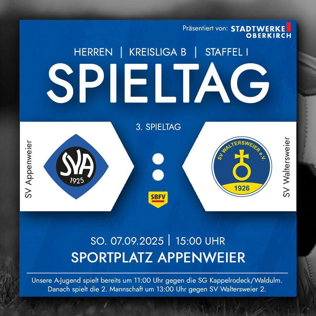Heute empfängt unser SVA den Tabellenführer SV Waltersweier. Die Gäste haben aus zwei Spielen 4 Punkte geholt, genau wie wir: ein Sieg, ein Unentschieden. Es ist also noch alles offen und wir erwarten ein spannendes Duell. Unsere Mannschaft muss hochkonzentriert auftreten, denn Geschenke gibt es heute nicht! ☀ Bei bestem Spätsommerwetter heißt es: Fußball pur in Appenweier. 11:00 Uhr – A-Jugend unserer SG 13:00 Uhr – Herren Reserve vs. Waltersweier II 15:00 Uhr – Herren vs. Waltersweier I Kommt vorbei, unterstützt unsere Teams und verbringt einen tollen Fußballtag auf dem Sportplatz in Appenweier! Für das leibliche Wohl ist selbstverständlich gesorgt. Der heutige Spieltag wird präsentiert von: Stadtwerke Oberkirch GmbH