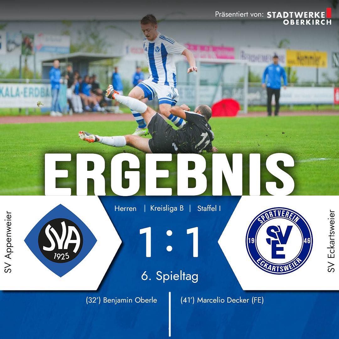 Der SV Appenweier und der SV Eckartsweier trennten sich am Sonntag in einem intensiven und kampfbetonten Spiel 1:1-Unentschieden. Für viele Zuschauer war es eines der besseren Spiele dieser Saison – geprägt von hohem Einsatz, Zweikämpfen und phasenweise guten spielerischen Ansätzen, auch wenn klare Torchancen Mangelware blieben. Die Anfangsphase gehörte den Gästen, die früh zwei gefährliche Möglichkeiten hatten, doch SVA-Keeper Müller verhinderte den Rückstand mit starken Paraden. Appenweier brauchte einige Minuten, um ins Spiel zu finden, übernahm dann aber mehr Kontrolle. In der 32. Minute belohnte sich der SVA für seine Überlegenheit: Nach einer Ecke staubte Benjamin Oberle zum verdienten 1:0 ab. Allerdings hielt die Führung nicht lange. Kurz vor der Pause verursachte Appenweier einen vermeidbaren Foulelfmeter, den Decker für Eckartsweier sicher zum 1:1 verwandelte (40.). Mit diesem Ergebnis ging es in die Halbzeit, in der Appenweier trotz klarer Vorteile das Spiel nicht in Ruhe kontrollieren konnte. Nach dem Seitenwechsel dominierte der SVA über weite Strecken Ball und Spielgeschehen. Chancen durch Haas (53.), Schwab (75.) und erneut Oberle kurz vor Schluss (88.) blieben jedoch ungenutzt. Eckartsweier zog sich tief zurück, lauerte nur noch auf Konter und wirkte im Angriff weitgehend harmlos. Die letzten Minuten waren von viel Kampf und langen Bällen geprägt, ohne dass noch ein Treffer fiel. Am Ende steht ein 1:1, mit dem beide Mannschaften leben müssen. Für Appenweier ist es bitter, weil deutlich mehr Ballbesitz und Spielkontrolle nicht in drei Punkte umgemünzt werden konnten. Dennoch war es spielerisch ein ordentliches Match – und unter dem Strich wohl ein gerechtes Ergebnis.