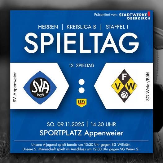 Nach dem vergangenen spielfreien Wochenende ist unsere Mannschaft etwas abgerutscht in der Tabelle. Neuer Tabellenführer ist die SG Ataspor Offenburg, der SVA folgt mit 4 Punkten Rückstand auf Platz 5. am heutigen Spieltag kommt die SG Weier/Bühl nach Appenweier, die in den kommenden Wochen einen starken Lauf zu verzeichnen hat und bis auf Platz 2 (3 Punkte vor dem SVA) vorgerückt ist. Die Offenburger Teildörfler konnten ihre letzten 5 Spiele allesamt gewinnen, darunter ein Sieg gegen Ataspor, sowie ein deutlicher 6:1 Sieg gegen den SC Sand am letzten Wochenende. Der SV Appenweier sollte also gewarnt sein vor einem starken Gegner mit viel Selbstvertrauen. Die Mannschaft von Trainer Onur Coban braucht sich jedoch nicht zu verstecken. Obwohl in der bisherigen Hinrunde die Ergebnisse noch von Unkonstanz geprägt sind, kann das Team vor allem mit einer starken Defensive aufwarten und ist schwer zu schlagen. Nach vorne tat sich der SVA vielfach noch schwer die nötige Durchschlagskraft zu entwickeln. Das Tabellenbild ist weiter sehr eng und mit einem Dreier gegen Weier/Bühl kann der SVA einen erfolgreichen Endspurt der Hinrunde einläuten. Kommen Sie heute an den heimischen Sportplatz und unterstützen Sie unsere Mannschaften. Für das leibliche Wohl ist wie immer bestens gesorgt. Bitte beachten Sie, dass ab sofort die Spiele aufgrund der Winterzeit eine halbe Stunde früher angepfiffen werden. Sonntag 09.11.25 – 12:30 Uhr SV Appenweier 2 – SG Weier/Bühl 2 Sonntag 09.11.25 – 14:30 Uhr SV Appenweier – SG Weier/Bühl Der heutige Spieltag wird präsentiert von: Stadtwerke Oberkirch GmbH