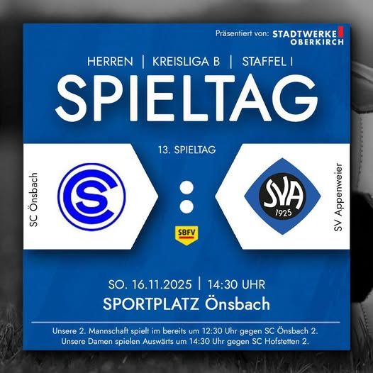 Heute heißt es für unsere Teams: Fokus auf die Basics und gemeinsam zurück in die Spur kommen! Gegen den SC Önsbach wartet ein Gegner aus dem Tabellenmittelfeld – mit 5 Siegen und 5 Niederlagen eine machbare, aber nicht zu unterschätzende Aufgabe. Nach den zuletzt schwierigen Wochen wollen wir mit kleinen, konsequenten Aktionen wieder Selbstvertrauen tanken. Auf vermutlich tiefem Geläuf brauchen wir heute vor allem Kampfgeist, Laufbereitschaft und volle Konzentration, um die Punkte zu holen. 💪⚽ Unsere Mannschaften freuen sich über jede Unterstützung vor Ort! 📅 HEUTE – Sonntag, 16.11.25 12:30 Uhr – SC Önsbach 2 vs. SV Appenweier 2 14:30 Uhr – SC Önsbach vs. SV Appenweier Auch unsere Damen sind im Einsatz – heute um 14:30 Uhr auswärts gegen Hofstetten 2. Feuert sie kräftig an! 🙌💙 Der heutige Spieltag wird präsentiert von: Stadtwerke Oberkirch GmbH