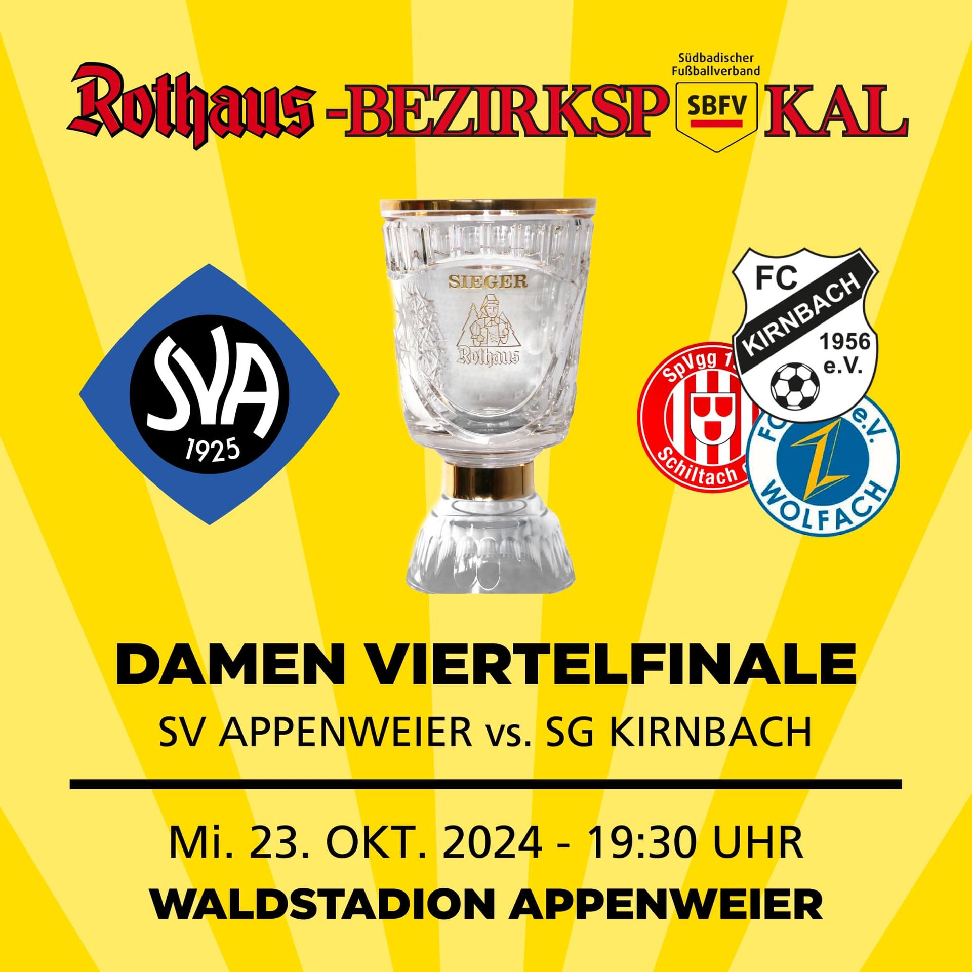 Am Mittwoch findet das Viertelfinale des Bezirkspokals der Damen statt! Unsere Mannschaft ist Gastgeber und tritt gegen die SG Kirnbach an. Anpfiff ist um 19:30 Uhr in Appenweier, gespielt wird auf dem Winterrasen unter Flutlicht. Kommt vorbei und unterstützt unser Team, denn die Mädels wollen ins Halbfinale einziehen und brauchen jede Unterstützung! Unser Clubheim ist geöffnet und für Bewirtung ist bestens gesorgt.
