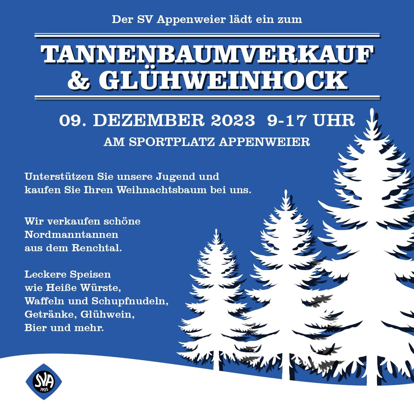 Der SV Appenweier lädt ein zum Tannenbaumverkauf und Glühweinhock am Samstag, den 9.12.2023. Ab 9 Uhr könnt ihr aus wunderschönen Nordmanntannen aus dem Renchtal auswählen. Mit eurem Kauf unterstützt ihr unsere Jugendabteilung. Außerdem könnt ihr ein paar schöne Stunden bei uns verbringen mit Glühwein, Schupfnudeln, Bier, Waffeln und mehr von 9-17 Uhr. Bäume solange der Vorrat reicht.