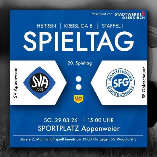 Am heutigen Ostersamstag geht es für unseren SV Appenweier auswärts zum SC Sand. Die Gastgeber stehen aktuell mit 37 Punkten auf dem zweiten Tabellenplatz, während unser Team mit fünf Zählern Rückstand auf Rang fünf liegt. Auf dem kleinen Kunstrasenplatz in Sand wird uns ein intensives Spiel erwarten. Um dort zu bestehen, braucht es von Beginn an volle Einsatzbereitschaft: Zweikämpfe gewinnen, als Team geschlossen auftreten und vor allem den unbedingten Willen zeigen, etwas Zählbares mit nach Appenweier zu nehmen. Das Spiel der zweiten Mannschaft wurde abgesagt, da der SV Sand derzeit keine Mannschaft stellen kann. Umso wichtiger ist es, dass wir heute zusammenstehen: Kommt um 16:00 Uhr nach Sand und unterstützt unsere Mannschaft lautstark! Der heutige Spieltag wird präsentiert von Stadtwerke Oberkirch GmbH